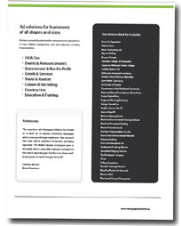 Who advertiseswith the Journal?Any company or individual who wants to reach Canadian consumers regionally, provincially or nationally.Sample AdsYour word ad is inserted in the Classified section of the weekly newspapers, under the appropriate heading. Your classified ad will run in all newspapers in the region you select in the same week. Classified ads are words only, no graphics, bold or underlining. There is a base charge for 25 words or less, with a charge for each additional word over 25. See the Rate Card for specific information. There is a limit of 100 words. Please contact us if you would like assistance in preparing your ad. Effective ads often use a leading phrase in all-capitals, action words and include a phone number and/or website. Some examples